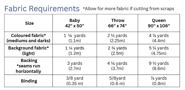 It is a delightfully scrappy quilt. Choose a colourway and and grab some background fabric. The more scrappy the better!