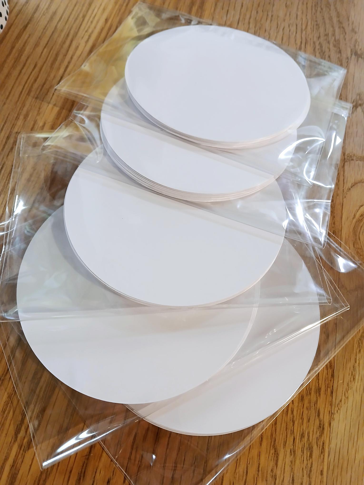 Circle paper packs for making prepared edge applique shapes are available as an optional extra. Each pack contains 16 paper circles. The pattern can be purchased with one or two circle packs.